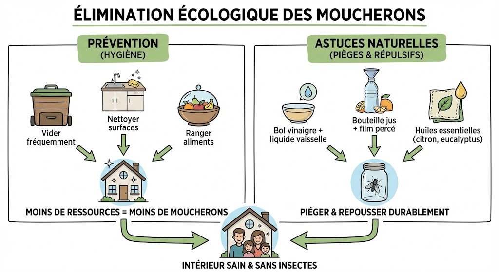Plusieurs techniques douces se révèlent très efficaces pour piéger ou repousser les moucherons. Un bol de vinaigre de cidre additionné de liquide vaisselle attire les moucherons, qui s’y retrouvent piégés. Autre astuce efficace : une bouteille partiellement remplie de jus de fruit, recouverte de film alimentaire percé, capte l’attention grâce à l’odeur sucrée.
