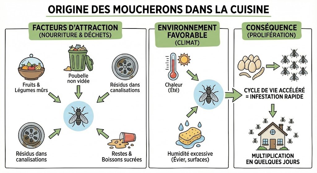 Les moucherons sont de véritables opportunistes. Ils apparaissent rarement par hasard : leur venue résulte de la combinaison de plusieurs facteurs typiques des cuisines. En comprenant mieux leur mode de vie, il est possible d’anticiper leur prolifération et d’agir plus efficacement contre eux.