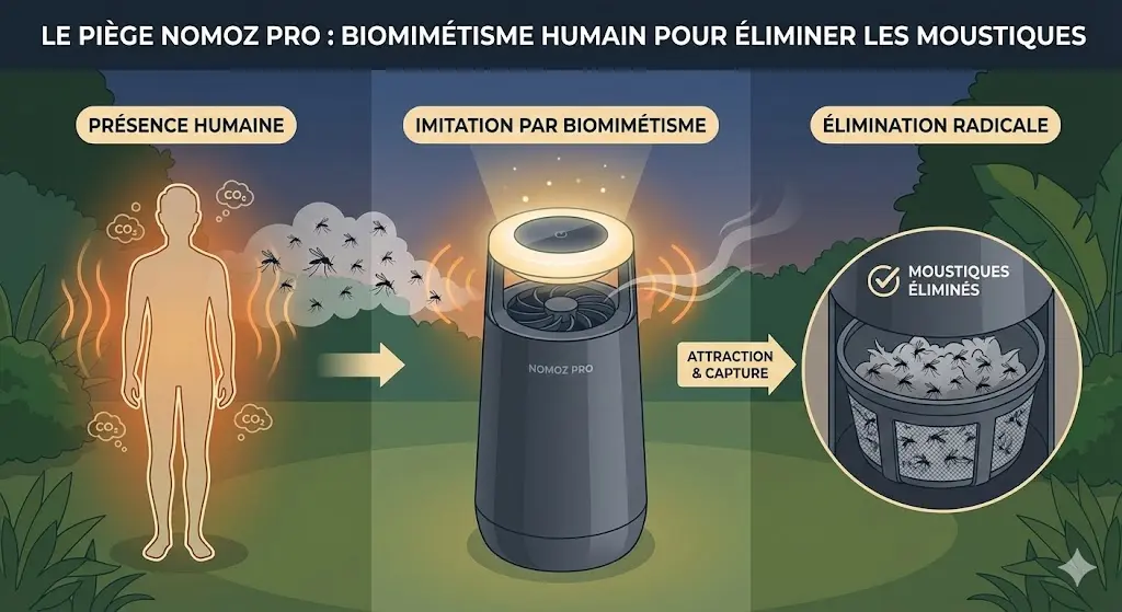 Ce qu’il faut retenir : le piège Nomoz Pro utilise le biomimétisme pour imiter la présence humaine et éliminer radicalement les moustiques, là où les méthodes classiques échouent. Cette innovation brevetée et sans pesticides permet de reconquérir durablement les jardins, réduisant les nuisances de plus de 85 % sur une surface de 1000 m².
